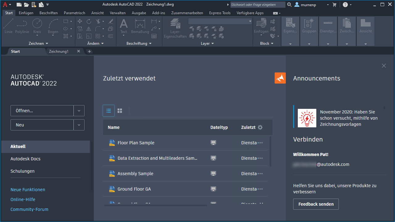 Die Registerkarte Start wurde überarbeitet, um eine konsistente Begrüßung in den Autodesk-Produkten zu ermöglichen.