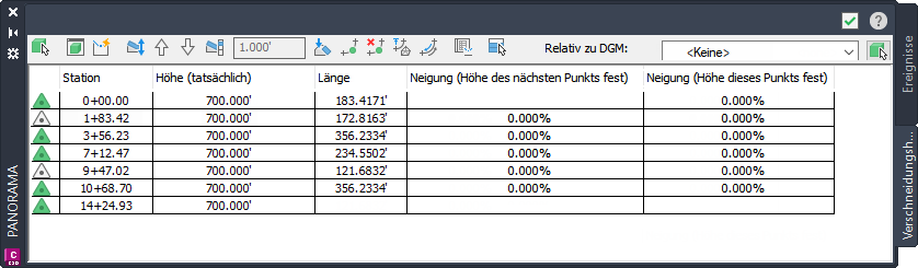 Der Höheneditor in Abbildung 1 zeigt die Höhen für die quadratischen Elementkanten an, die an den Stellen, an denen diese Kanten die anderen Elementkanten kreuzen, zwei Teilungspunkte aufweisen. Im Höheneditor wird in der ersten Spalte für Punkte, an denen sich zwei Elementkanten schneiden, neben dem Punktsymbol ein Pluszeichen (+) angezeigt.