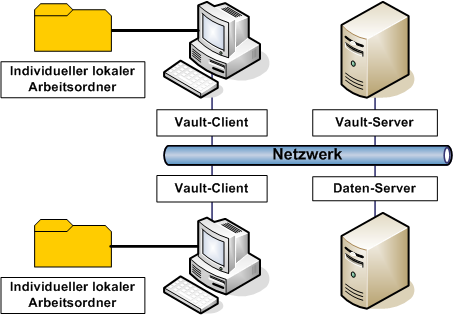 Werden die Arbeitsordner auf lokalen Computern gespeichert (siehe Abbildung 7), wird der Datenverkehr im Netzwerk minimiert, und es werden auch Teammitglieder unterstützt, die offline vor Ort oder von zu Hause aus arbeiten. Lediglich beim Ein- und Auschecken von Dateien durch Benutzer nimmt der Datenverkehr im Netzwerk zu.
