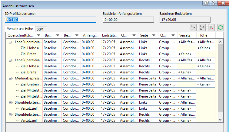 Mit Autodesk Civil 3D können Sie eine Reihe von Elementen in 3D-Profilkörpermodellen als Ziele definieren, so z. B. Elementkanten, die in Gebietsverschneidungen eine Hauptkomponente darstellen. Dies bedeutet, dass Sie 3D-Profilkörpermodelle und Gebietsverschneidungen integrieren können, sodass sie miteinander interagieren. Mithilfe mehrerer Ziele können Sie Verbindungen zu verschiedenen Komponenten der Gebietsverschneidung erstellen, ohne Zeit mit dem Erstellen von komplexen Achsen und Längsschnitten verbringen zu müssen.