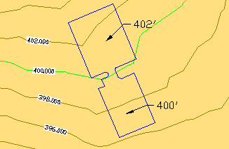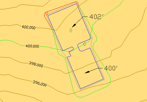Beginnen Sie mit einer Gebäudesohle, der die grundlegenden Höhen bereits zugewiesen wurde. In diesem Beispiel befindet sich der obere Teil der Baugrube auf einer Höhe von 402 Fuß und der untere Teil auf einer Höhe von 400 Fuß.