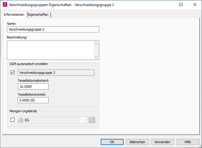 Um das Problem mit der Bogentriangulation zu beheben, müssen Sie für den Tessellationsabstand der Verschneidungsgruppe einen kleineren Wert festlegen. Wie in Abbildung 26 zu sehen ist, ist es möglicherweise schwierig, im Dialogfeld Verschneidungsgruppen-Eigenschaften das Feld für die Eingabe des Tessellationsabstands zu finden, da dieser Wert nur eingegeben werden kann, wenn die Option DGM automatisch erstellen aktiviert ist. Diese Einstellung wird jedoch auch für den Befehl Losgelöstes DGM erstellen sowie für die Triangulation der Flächenverschneidung verwendet. Die beste Lösung für diese Situation ist, die Option DGM automatisch erstellen zu aktivieren, den Standardwert für den Tessellationsabstand von 10 Fuß in 1 Fuß zu ändern und die Option DGM automatisch erstellen wieder zu deaktivieren. Nach dem Aktivieren der Option DGM automatisch erstellen müssen Sie auf Anwenden klicken, um die geänderten Einstellungen anzuwenden.
