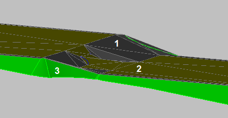 In Abbildung 24 ist dieselbe Verschneidung in einer schattierten 3D-Ansicht dargestellt. Die graue Fläche (1) ist die Flächenverschneidung, die das Bankett darstellt, die goldfarbene Fläche (2) ist die Flächenverschneidung der Baugrube, und die grüne Fläche (3) ist die Neigungsverschneidung auf das DGM.