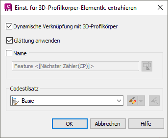 Ein optimales Verfahren ist, im Dialogfeld Einst. für 3D-Profilkörper-Elementk. extrahieren die Option Dynamische Verknüpfung zu aktivieren (siehe Abbildung 35), sodass in diesem Beispiel alle Aktualisierungen des 3D-Profilkörpers auch auf die Verschneidung in diesem Bereich angewendet werden. Außerdem sind Einstellungen zum Glätten vorhanden, um die Bildung der Elementkante um einen geschwungenen Bereich herum zu steuern. Weitere Informationen finden Sie unter Elementkantenglättung.