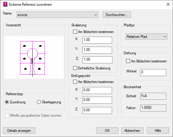 - Geben Sie im Dialogfeld Externe Referenz als Einfügepunkt 0,0,0, als Skalierung 1,1,1 und als Drehwinkel 0 an.