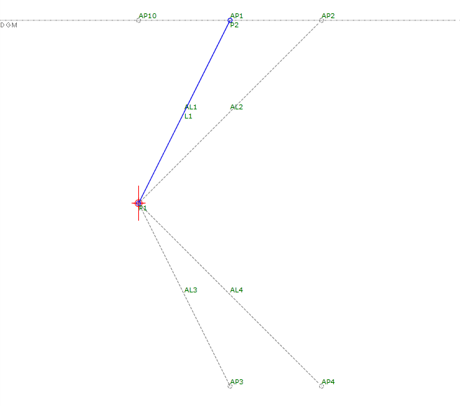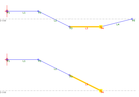 In diesem Beispiel wird ein Hilfspunkt (Auxiliary Point) verwendet, um die Höhe des Ziel-DGMs zu erreichen. Der Y-Wert von P3 relativ zum Y-Wert des DGMs AP1 bestimmt die Geometrie: