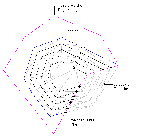 Begrenzungen sind geschlossene Polylinien, die sich auf die Sichtbarkeit der Dreiecke innerhalb oder außerhalb der Polylinien auswirken. Die Grenzen des DGM werden durch eine äußere Begrenzung definiert. Alle Dreiecke innerhalb der Begrenzung sind sichtbar, alle außerhalb der Begrenzung befindlichen Dreiecke sind unsichtbar.