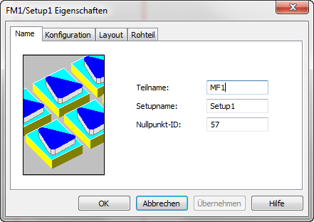 Die Registerkarten enthalten die Optionen aus den Dialogfeldern Setup, Nullpunkte, Konfiguration, Layout und Rohteil.