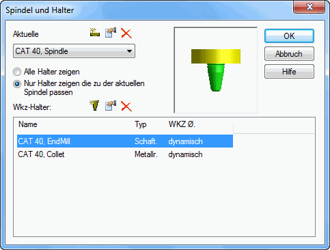 Verwenden Sie das Dialogfeld Spindeln und Werkzeughalter, um neue Spindeln und Werkzeughalter anzuzeigen, zu bearbeiten und zu erstellen.
