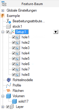 Im Feature-Baum werden die acht erstellten Bohrungen angezeigt: