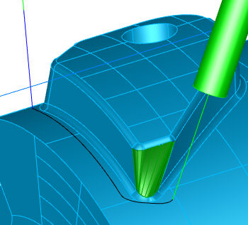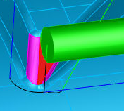 Im Bild unten besteht das Feature aus den zwei violetten und einer roten Fläche. Beim Walzenfräsen wird die gewünschte Kante der violetten Flächen korrekt geschnitten, und dann wird (mathematisch korrekt) eine nicht erwünschte Kante an der roten Fläche geschnitten.