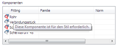 In der Komponententabelle ist ein Basissatz Komponenten für den angezeigten oder erstellten Stil aufgelistet. Symbole geben an, ob die Komponente optional oder erforderlich ist und ob es spezifische Probleme mit der Komponente gibt. Wenn Sie den Cursor über das Symbol halten, wird eine Beschreibung angezeigt.