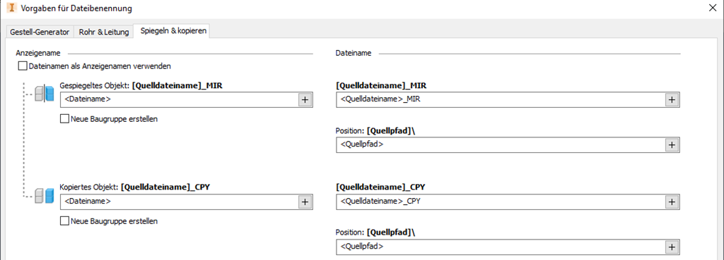 Das Dialogfeld Dateibenennung wurde verbessert und unterstützt nun die Befehle Spiegeln und Kopieren.