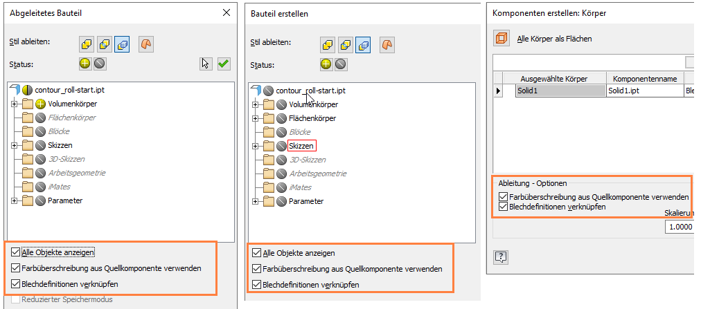 Die folgenden Ableitungseinstellungen bleiben jetzt beim Erstellen eines abgeleiteten Bauteils über mehrere Sitzungen hinweg erhalten. Vorgabemäßig sind diese Einstellungen aktiviert. Wenn Sie die Auswahl einer Einstellung aufheben, bleibt die Einstellung so lange deaktiviert, bis Sie sie erneut auswählen.