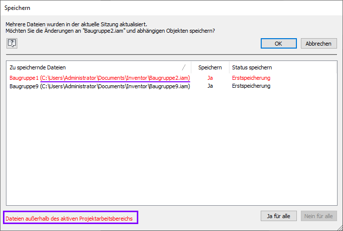 Der Speichervorgang wurde verbessert, sodass Sie Dateien, die Sie gerade speichern und die sich nicht im aktiven Projekt befinden, schnell ermitteln können. Dateien, die sich nicht im aktiven Projekt befinden, werden rot angezeigt.