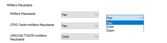 Die Registerkarte Anzeige im Dialogfeld Anwendungsoptionen enthält jetzt Einstellungen, mit denen Sie die mittlere Maustaste den Funktionen zum Zoomen, Schwenken oder Umkreisen zuordnen können.