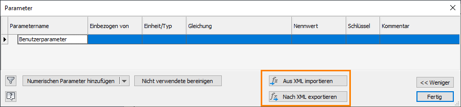 Gruppe Parameter Aus XML importieren und Nach XML exportieren können nun auch über das Dialogfeld Parameter aufgerufen werden.