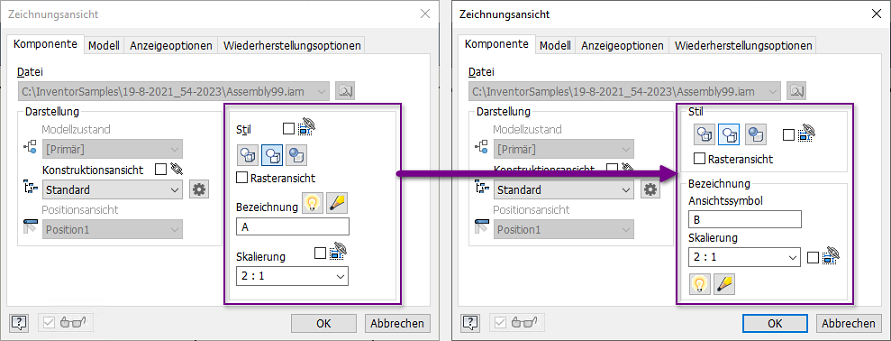 - Das Dialogfeld Zeichnungsansicht verfügt über eine aktualisierte Benutzeroberfläche zur Ansichtsbeschriftung.