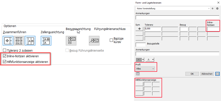 - Form- und Lagetoleranzen: Das Symbol Alles auf den Form- und Lagetoleranzen. Verwenden Sie die neue Option Alles im Dropdown-Menü Profil im Dialogfeld Form- und Lagetoleranzen.