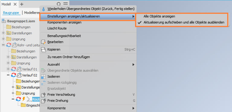 Jetzt können Sie über das Kontextmenü der Route auf die Befehle Alle Objekte anzeigen/Aktualisierung aufschieben und alle Objekte ausblenden zugreifen.