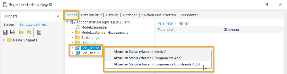 | Die neuen Befehle zum Erfassen des aktuellen Status können Sie aufrufen, indem Sie mit der rechten Maustaste auf eine oder mehrere Dateien im Regel-Editor auf der Registerkarte Modell klicken. | Hier sehen Sie ein Beispiel für eine Regel, die aus dem Befehl Constraints.Add generiert wurde. Nach dem Hinzufügen zum Regel-Editor können Sie Änderungen am Inhalt direkt im Regel-Editor vornehmen. |