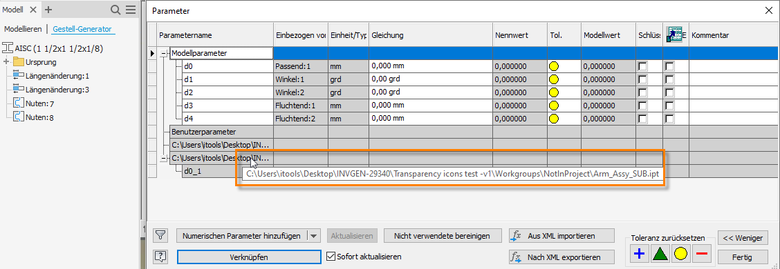 Die QuickInfo für Benutzerparameter wurde erweitert und zeigt nun den vollständigen Pfad der Quelldatei an, aus der ein Benutzerparameter verknüpft ist.