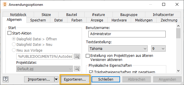 | Klicken Sie im Dialogfeld Anwendungsoptionen auf Exportieren. Beim Exportieren werden die aktuellen Anwendungsoptionen und die Einstellungen im Dialogfeld iLogic-Konfiguration in einer XML-Datei gespeichert.