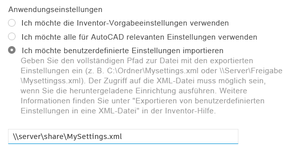 | Wählen Sie beim Erstellen der Einrichtung die Option Ich möchte benutzerdefinierte Einstellungen importieren, und geben Sie den Pfad zur exportierten XML-Datei ein.