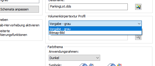 Volumenkörpertextur Profil können Sie eine Texturzuordnung angeben, die mit den Abschlussflächen verwendet wird, die für Schnittansichten genutzt wird. Die Vorgabefarbe ist grau. Erstellen Sie ein Bild, und wählen Sie das Bild aus, um es als Volumenkörpertextur Profil zu verwenden, wenn Sie eine andere Farbe verwenden möchten.