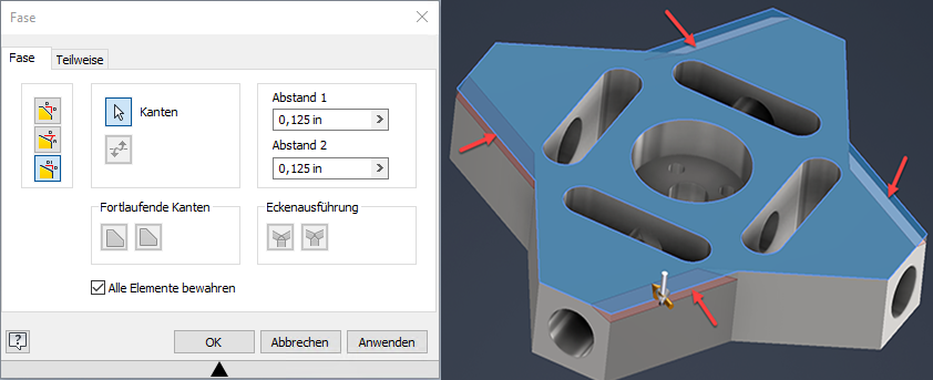 Bei Fasen des Typs Abstand-Abstand, vollständig oder partiell, können Sie mehrere nicht tangentiale Kanten auswählen.