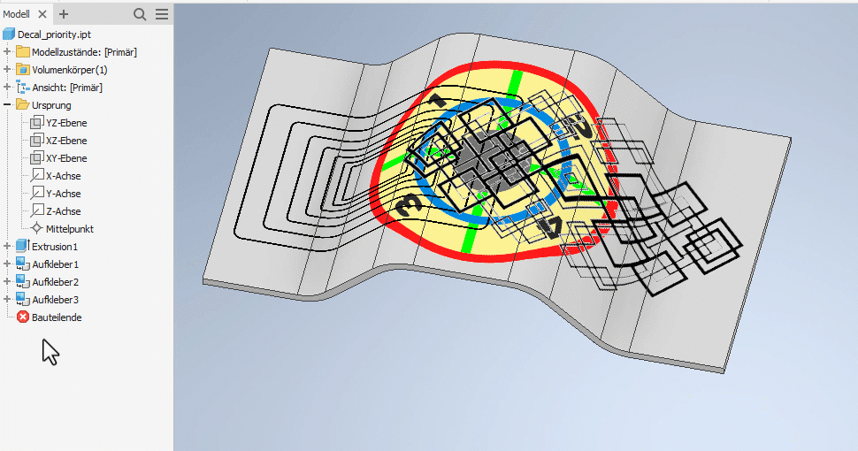 Wenn sich Aufkleber überlappen, wird die Anzeigepriorität von Aufklebern durch die Baumstrukturposition des Modells gesteuert.