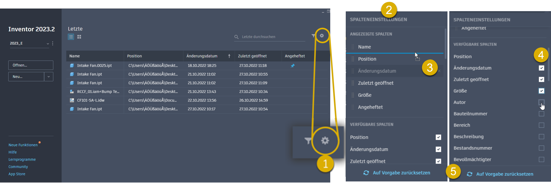 - Wählen Sie die anzuzeigenden Spalten und dann iProperties oder Mit Pin fixiert aus.