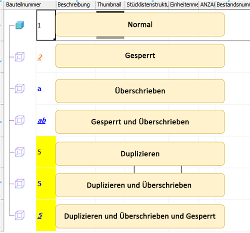 Stücklistenobjekte können überschrieben, dupliziert oder gesperrt werden. Die Positionsnummern werden für diese Bedingungen jetzt unterschiedlich angezeigt.