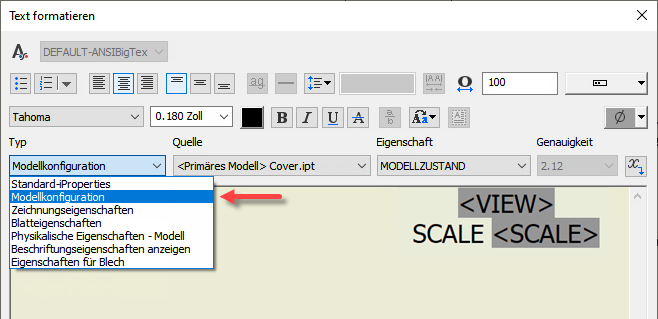 Dem Kombinationsfeld Typ im Dialogfeld Text formatieren wurde die neue Kategorie Modellkonfiguration hinzugefügt. Hier können Sie Ansichtsbeschriftungen so konfigurieren, dass sie einen Modellstatusnamen in Zeichnungsansichten anzeigen. Änderungen am Status des Ansichtsmodells werden in der Ansichtsbeschriftung widergespiegelt.