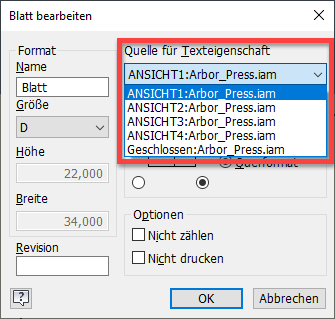 Jede Ansichtsmodellreferenz kann als primäre Eigenschaftenquelle für Text, Schriftfeld und Skizzensymbole in einem Zeichnungsblatt ausgewählt werden. Bisher referenzierten Eigenschaften im Text immer aus dem Modell in der ersten Zeichnungsansicht.