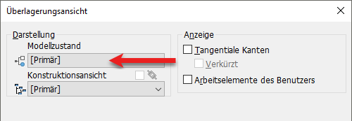 Beim Erstellen einer Überlagerungsansicht für Bauteile können Sie den gewünschten Modellzustand auswählen, der in der Ansicht angezeigt werden soll. Dies kann etwa nützlich sein, um ein Bauteil vor und nach der Verarbeitung anzuzeigen.