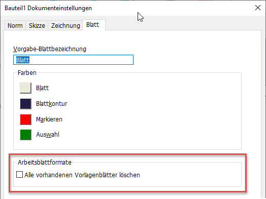 Die neue Option Alle vorhandenen Vorlagenblätter löschen, die in den Dokumenteinstellungen auf der Registerkarte Blatt hinzugefügt wurde, entfernt automatisch vorhandene Blätter, wenn Sie eine Zeichnung aus einem vordefinierten Arbeitsblattformat erstellen. Nur das Blatt aus dem Arbeitsblattformat wird beibehalten. Stellen Sie sicher, dass diese Option auch im gleichen Dokument (in der Regel eine Vorlage) aktiviert ist, das die Arbeitsblattformate enthält, die Sie verwenden.
