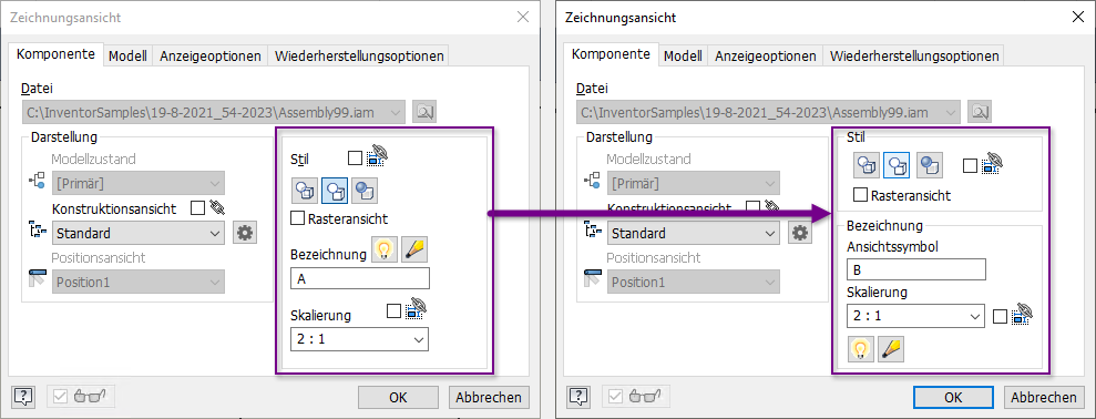 Modellzustandsname in Ansichtsbezeichnung in Zeichnungen