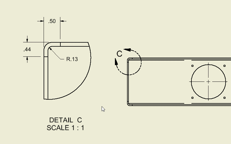 Verwenden Sie beim Bearbeiten einer Detailansicht den Befehl Detaileigenschaften bearbeiten, um die Umgrenzungsform der Detailansicht von kreisförmig in rechteckig zu ändern. Der Befehl wird über das Kontextmenü der Ansicht entweder im Browser oder im Plan aufgerufen.