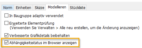 Im Baugruppen-Browser wird nun vorgabemäßig der Abhängigkeitsstatus als