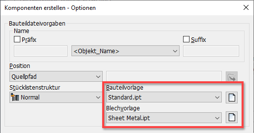 Unter Werkzeuge > Dokumenteinstellungen > Registerkarte Modellierung > Dialogfeld Komponenten erstellen - Optionen wurde eine neue Option für Blechvorlagen hinzugefügt, mit der Sie die Vorlage auswählen oder suchen können, die zum Erstellen neuer Blechbauteildateien verwendet wird.