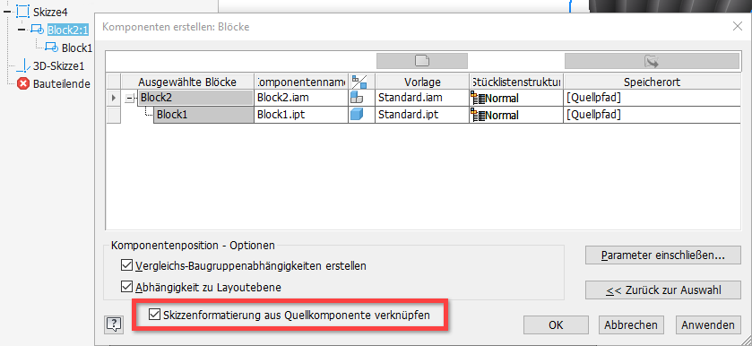 Die neue Option Skizzenformatierung aus Quellkomponente verknüpfen wurde dem Dialogfeld Ableiten hinzugefügt. Sie können damit steuern, ob die Skizzenblöcke im abgeleiteten Bauteil aktualisiert werden, wenn die Linien im Quellbauteil geändert werden.