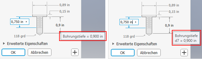 Wenn beim Befehl Bohrung ein Wert ungültig ist, beispielsweise, wenn die angegebene Gewindelänge größer als die Bohrungstiefe ist, wird der Wert rot angezeigt, und in der QuickInfo wird der Wert als ungültig angegeben, wenn Sie ihn eingeben. Dadurch können Sie den Wert sofort korrigieren oder einen anderen Wert suchen, der geändert werden muss, damit dieser Wert gültig wird. Wenn ein Wert gültig ist, wird er schwarz angezeigt.