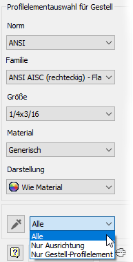Sie können jetzt Informationen aus vorhandenen Gestell-Profilelementen kopieren, wenn Sie die Profilelement-Befehle Einfügen und Ändern verwenden. Wählen Sie im Dialogfeld die Pipette aus, um Eigenschaften kopieren zu aktivieren, und wählen Sie dann ein Profilelement aus. Sie können wahlweise nur Gestell-Profilelement- oder nur Ausrichtungsinformationen oder beides kopieren.