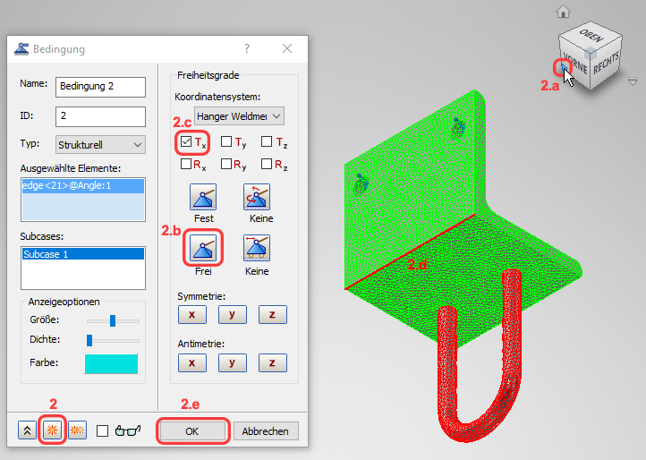 Die Vorgabe für den Abhängigkeitstyp ist strukturell und vollständig fest. Alle Freiheitsgrade (FHG) sind abhängig. Diese Einstellung eignet sich für die Montagebohrungen der Halterung.