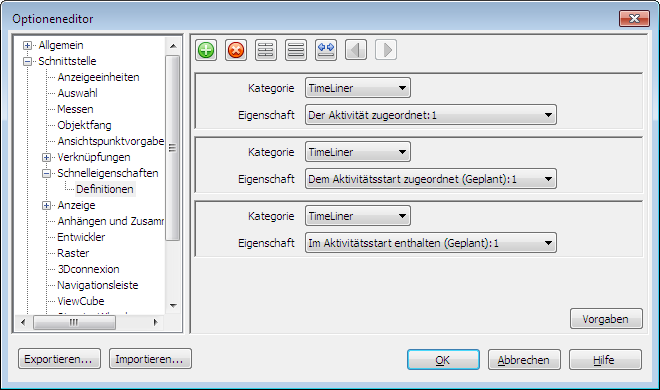 Fügen Sie weitere Definitionen hinzu, während TimeLiner im Feld Kategorie und die gewünschten Eigenschaften im Feld Eigenschaft ausgewählt sind.