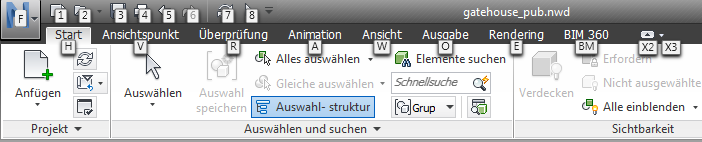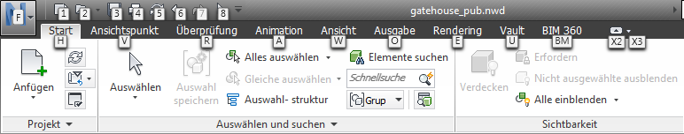 Navisworks bietet Zugriffstasten oder Tastentipps, sodass für die Interaktion mit dem Anwendungsfenster die Tastatur statt der Maus verwendet werden kann.