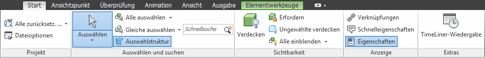 Manche der Registerkarten sind kontextabhängig. Wenn Sie bestimmte Befehle ausführen, wird anstelle eines Werkzeugkastens oder Dialogfelds eine kontextabhängige Multifunktionsleisten-Registerkarte eingeblendet. Beispiel: Sobald Sie mit der Auswahl von Elementen in der Szenenansicht beginnen, wird die zuvor ausgeblendete Registerkarte Elementwerkzeuge angezeigt. Wird keine Auswahl getroffen, wird sie wieder ausgeblendet.