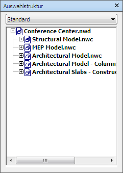Die Auswahlstruktur ist ein fixierbares Fenster mit verschiedenen Hierarchieansichten des Modells, wie sie von der ursprünglichen CAD-Anwendung, in dem das Modell erstellt wurde, festgelegt wurden.