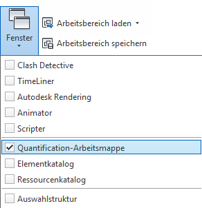 Klicken Sie in der Multifunktionsleiste auf die Registerkarte Ansicht, klicken Sie im Menü Arbeitsbereich auf die Dropdown-Liste Fenster, und wählen Sie Quantifizierungsarbeitsmappe, Elementkatalog oder Ressourcenkatalog aus.